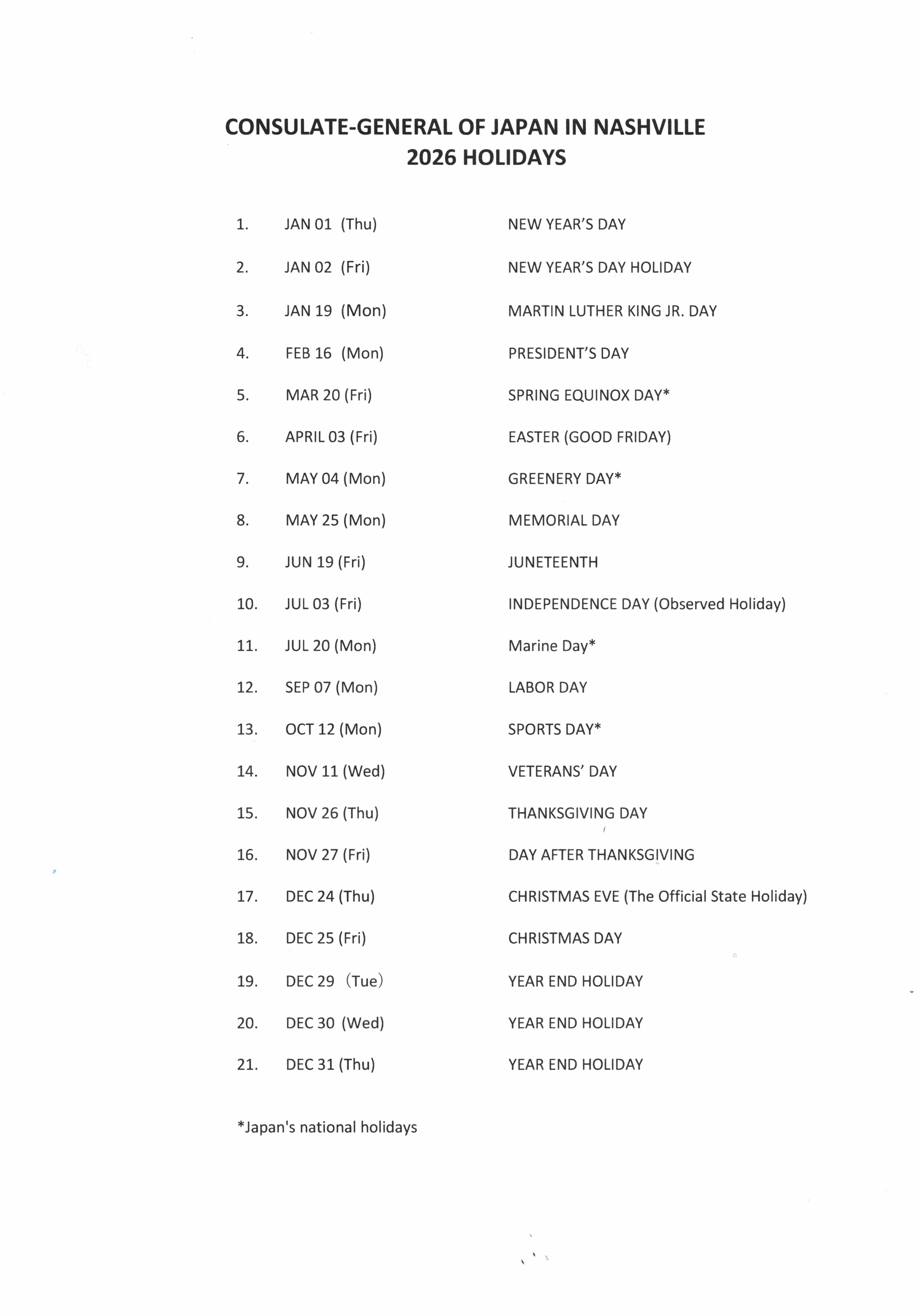 Consular Services at the Consulate-General of Japan in Nashville will be open to visitors only during the following times: