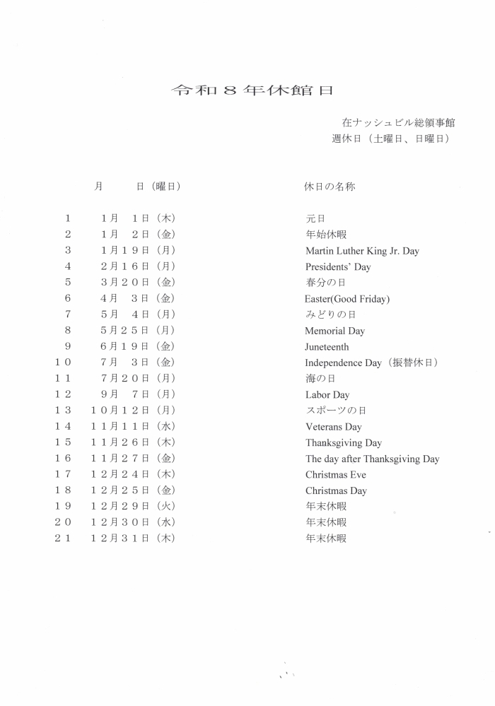 | 1月20日(月) | Birthday of Martin Luther King, Jr. |
