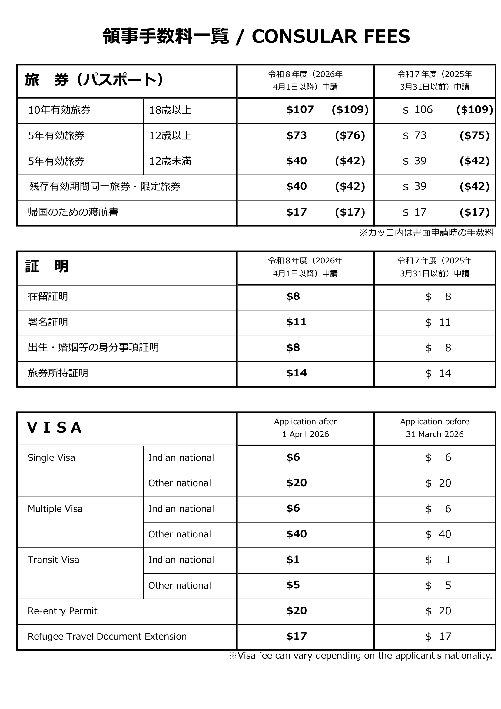 令和8年度(2026年度)領事手数料改定のお知らせ
